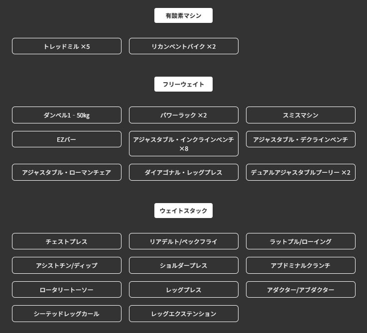また、初心者の方でも安心して利用できるウェイトスタックに加え、中上級者から人気の高いパワーラックやスミスマシンなど、多様な用途やレベルに応じた豊富なマシンを取り揃えているため、あなたに合ったトレーニングがきっと見つかります!